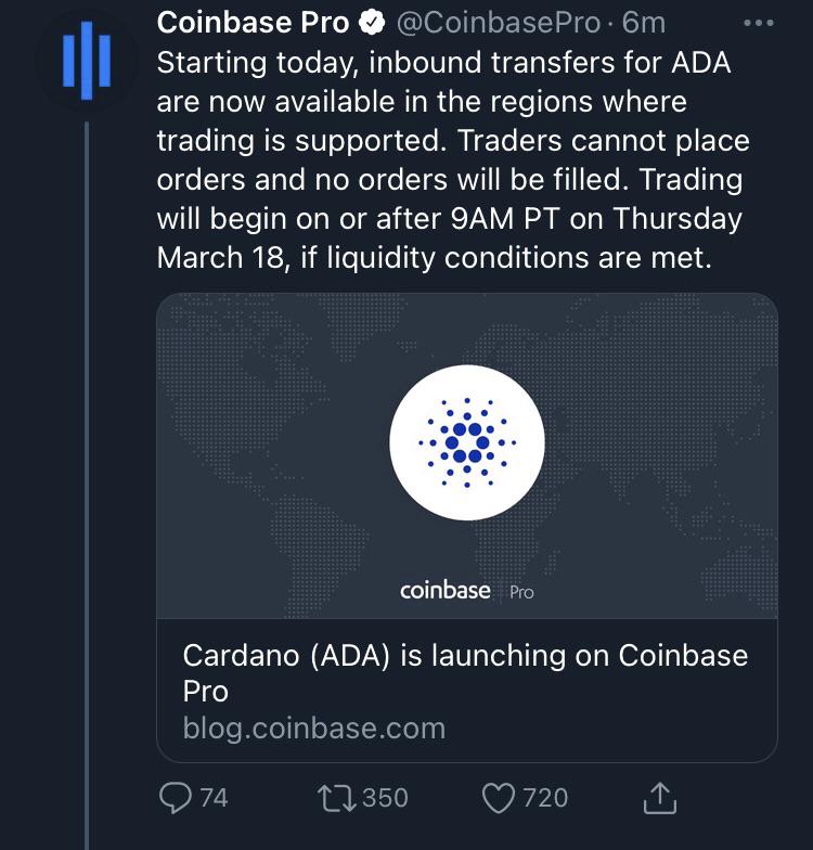 Jul 03, 2020 · cardano's native cryptocurrency, ada, may be listed on coinbase by the end of 2020.this news comes following an announcement that ada holders. Coinbase just announced this about cardano how ada will reach $100 | cardano ada news today. Starting today tuesday march 16, transfer ada into your coinbase pro account ahead of trading. The crypto space is always … Today in this video we're gonna talk about everything cardano ada, cardano price prediction 2021, cardano news today and ada cardano price. Cardano is 31,10 % below the all time high of 3,10 $. The current price is 2,136 $ per ada. 16.03.2021 · cardano (ada) is launching on coinbase pro. Days after being listed on coinbase pro, cardano's ada token is available to coinbase retail traders for the first time. Mar 16 · 3 min read. Many observes in the crypto space wondered what would need to happen for this day to arrive since the price of cardano in feb surged so much that in terms of market cap only bitcoin and ethereum were ahead of them. Polkastarter airdrop flamechain airdrop follow twitter join telegram trading signals channel follow youtube channel. In just the past hour, the price grew by 0,17 %.
