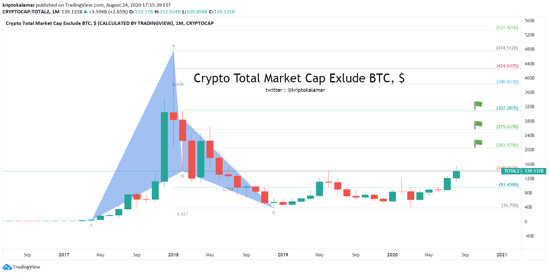 Let's explore both total crypto market caps, one with all cryptos offered on tradingview and the other with all of them minus bitcoin.