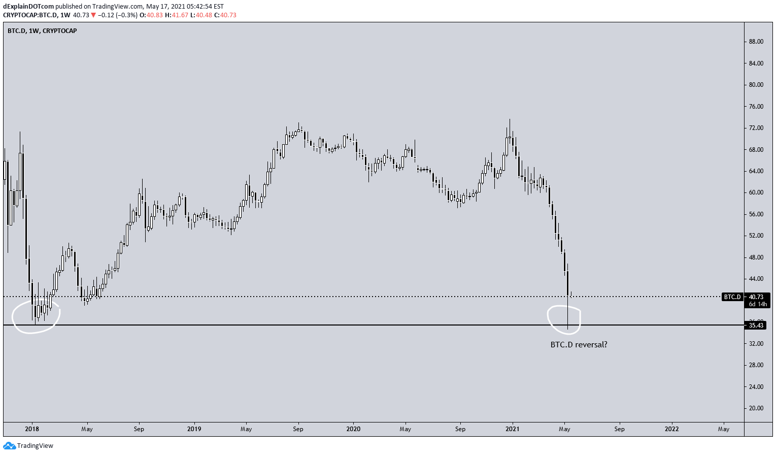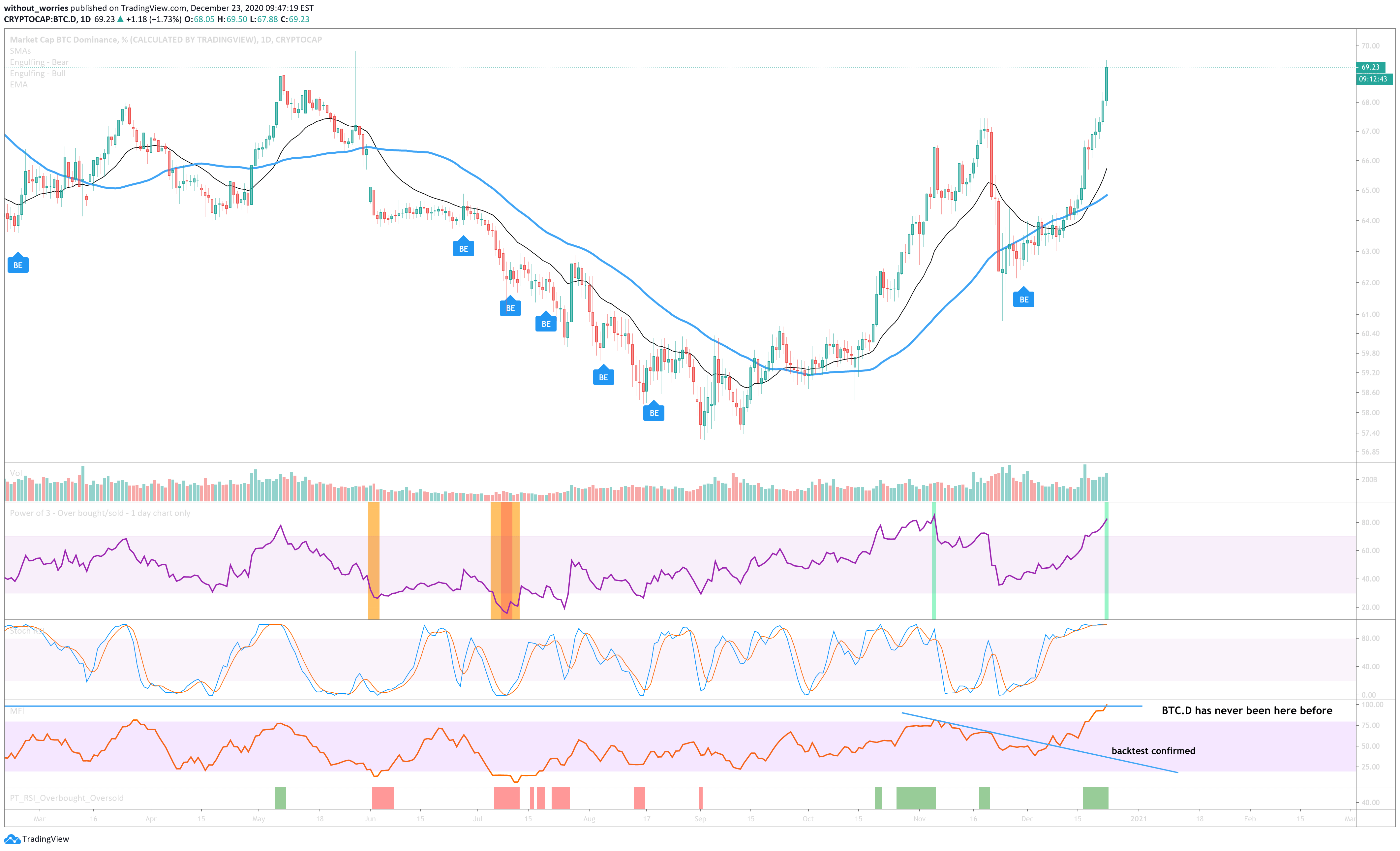 D market cap btc dominance, % (calculated by tradingview).